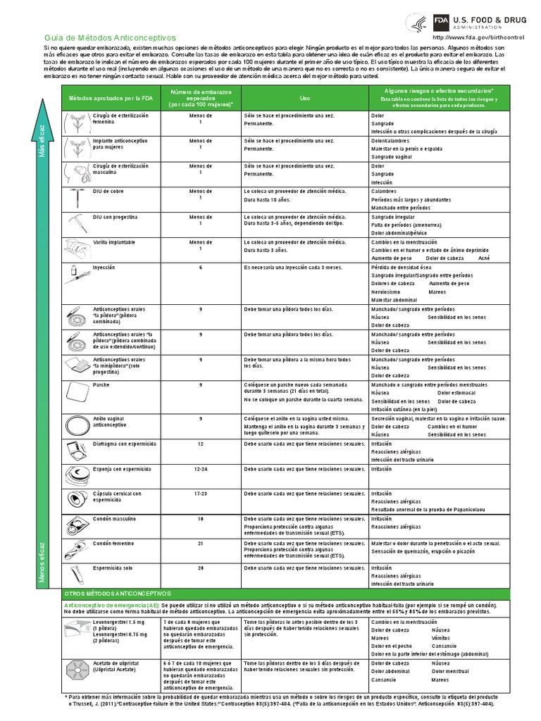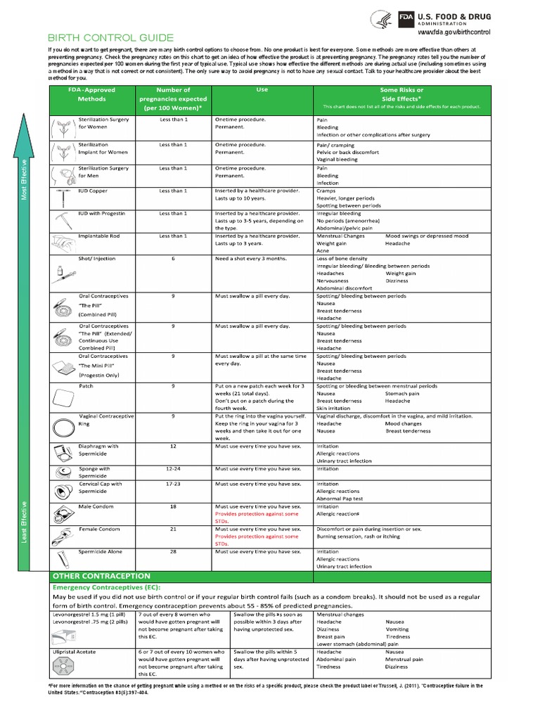 Birth Control Options Chart. Most contraceptive methods do not protect against sexually transmitted diseases (STDs). Birth control options IUD (Intrauterine Device) Implant (Nexplanon) Birth control shot (Depo-Provera) Birth control ring Birth control patch Birth control pill Diaphragm Condom Internal condom Cervical cap Fertility awareness Birth control sponge Spermicide Withdrawal (pull out) method Sterilization "Not right now" Emergency contraception All birth control methods are arranged in a chart, ranging from most effective methods at the top to least effective methods at the bottom.