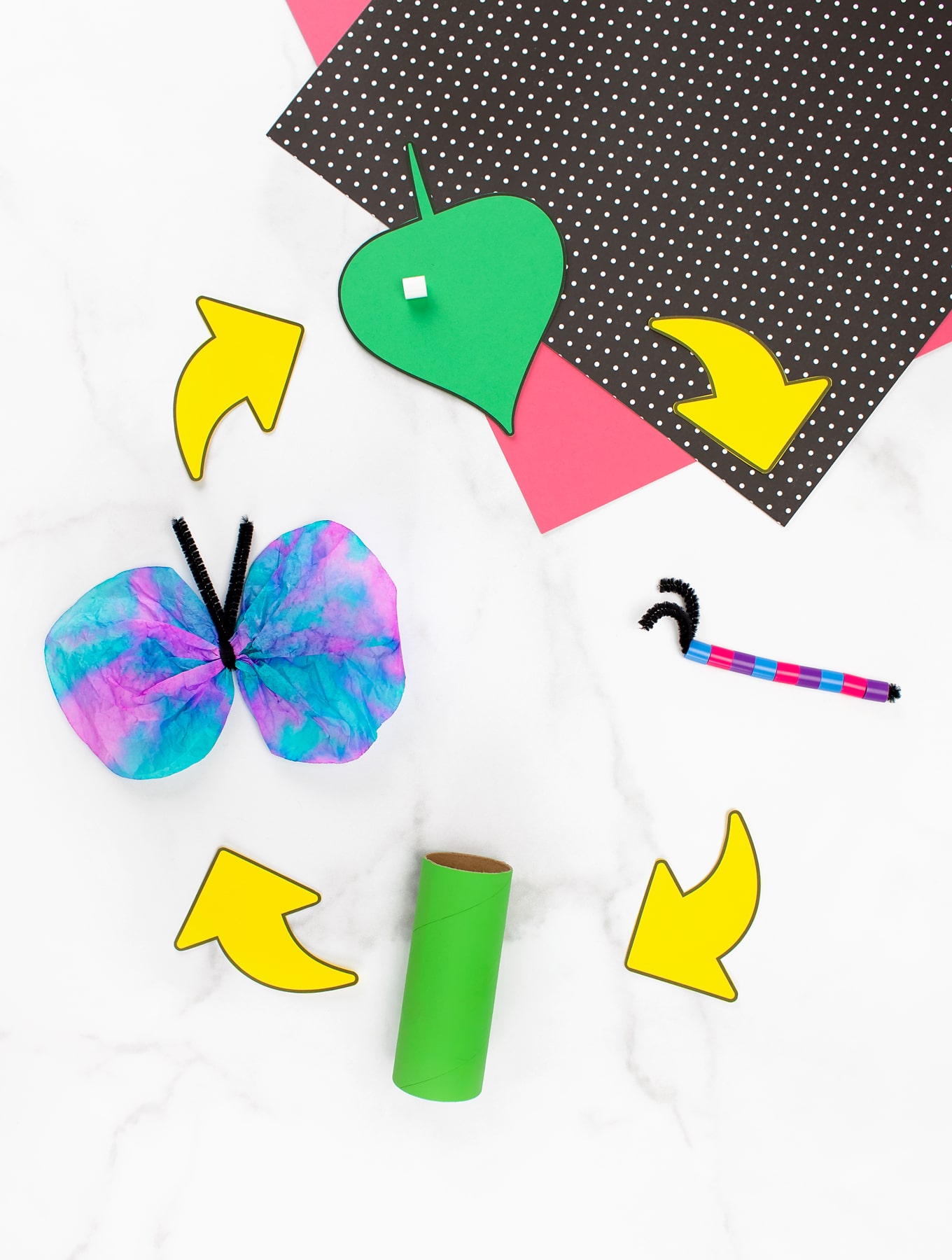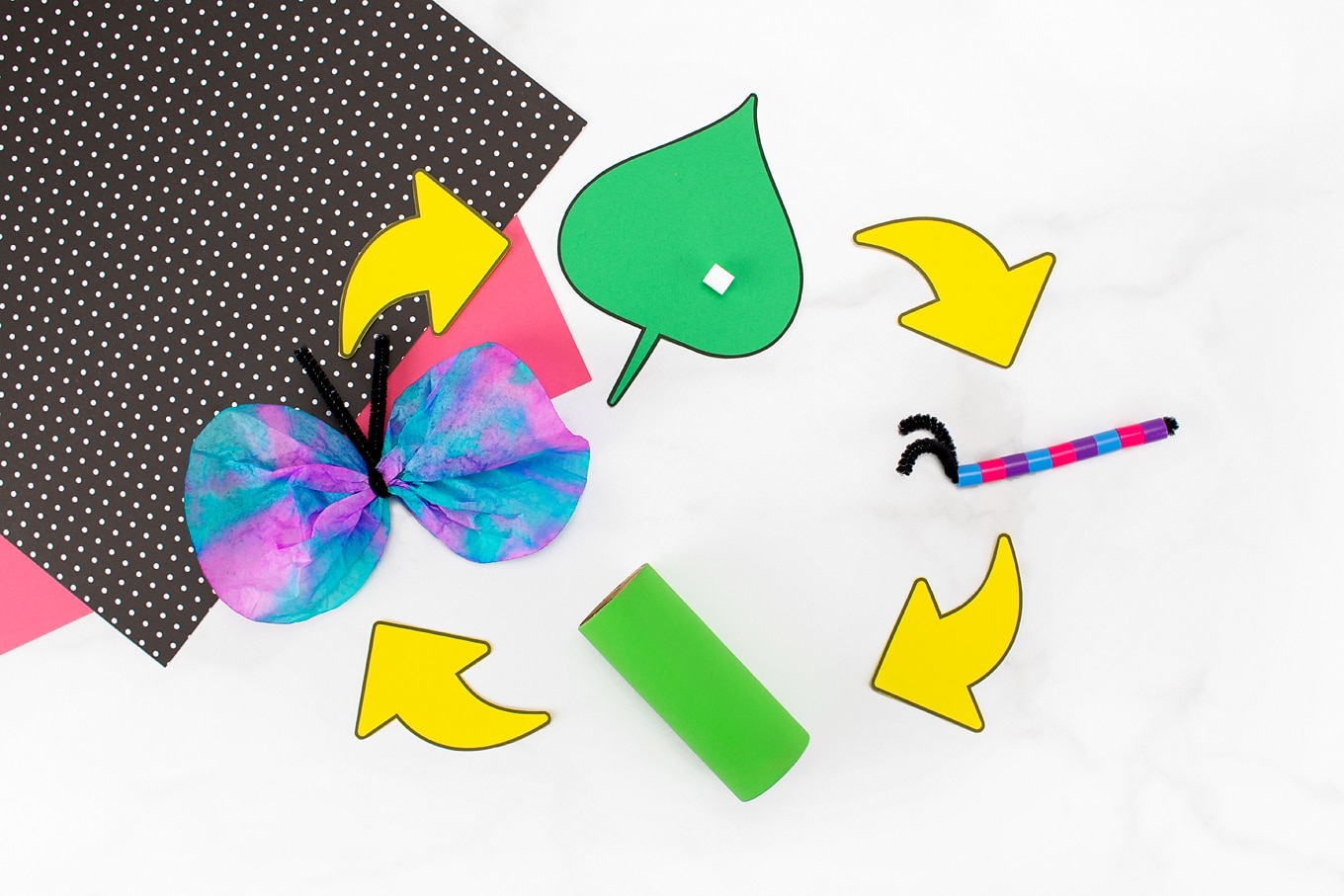 Provide a piece of string or yarn large enough to fit around their neck loosely. Glue or tape the pieces onto the base (we used two pieces of construction paper taped together, but you could use cardstock or a piece of poster board). Print out the free butterfly life cycle template.